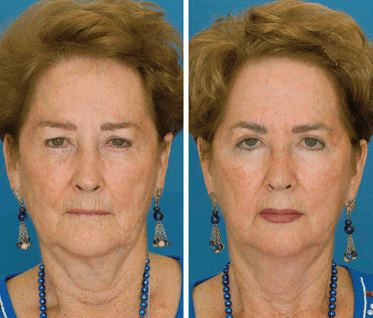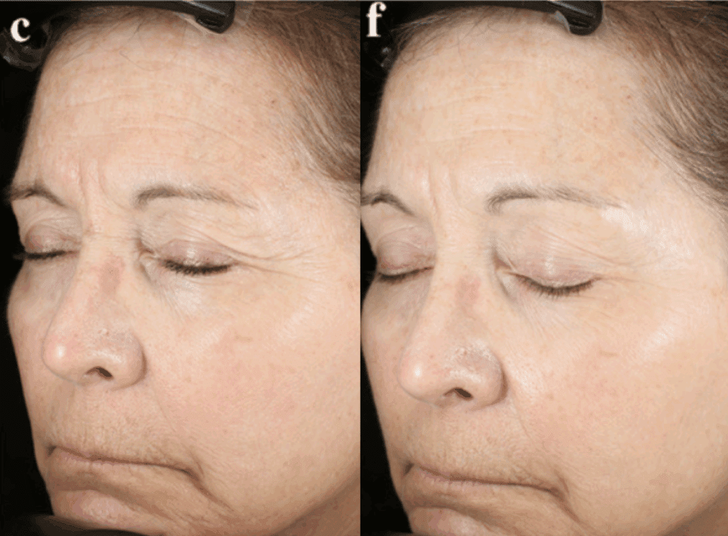 (f) After 6 weeks of hyaluronic acid treatment, left side of the face: increased light reflection (facial shine) due to smoother skin surface and reduction in fine lines.